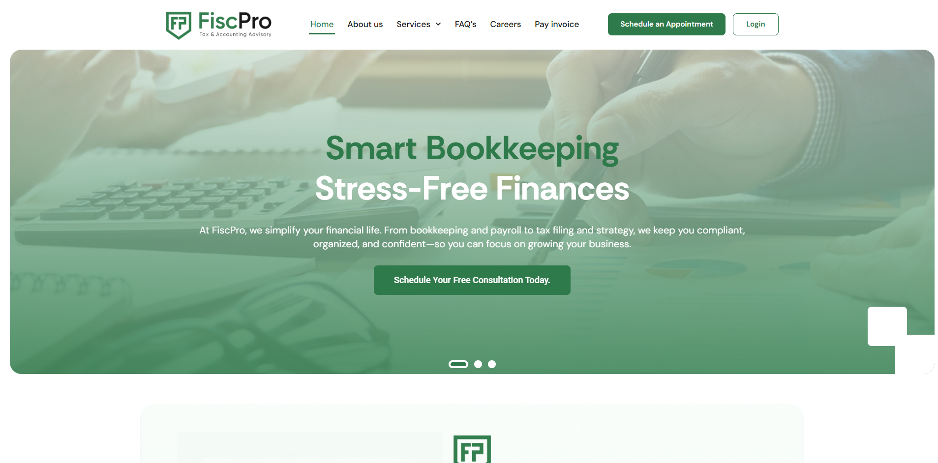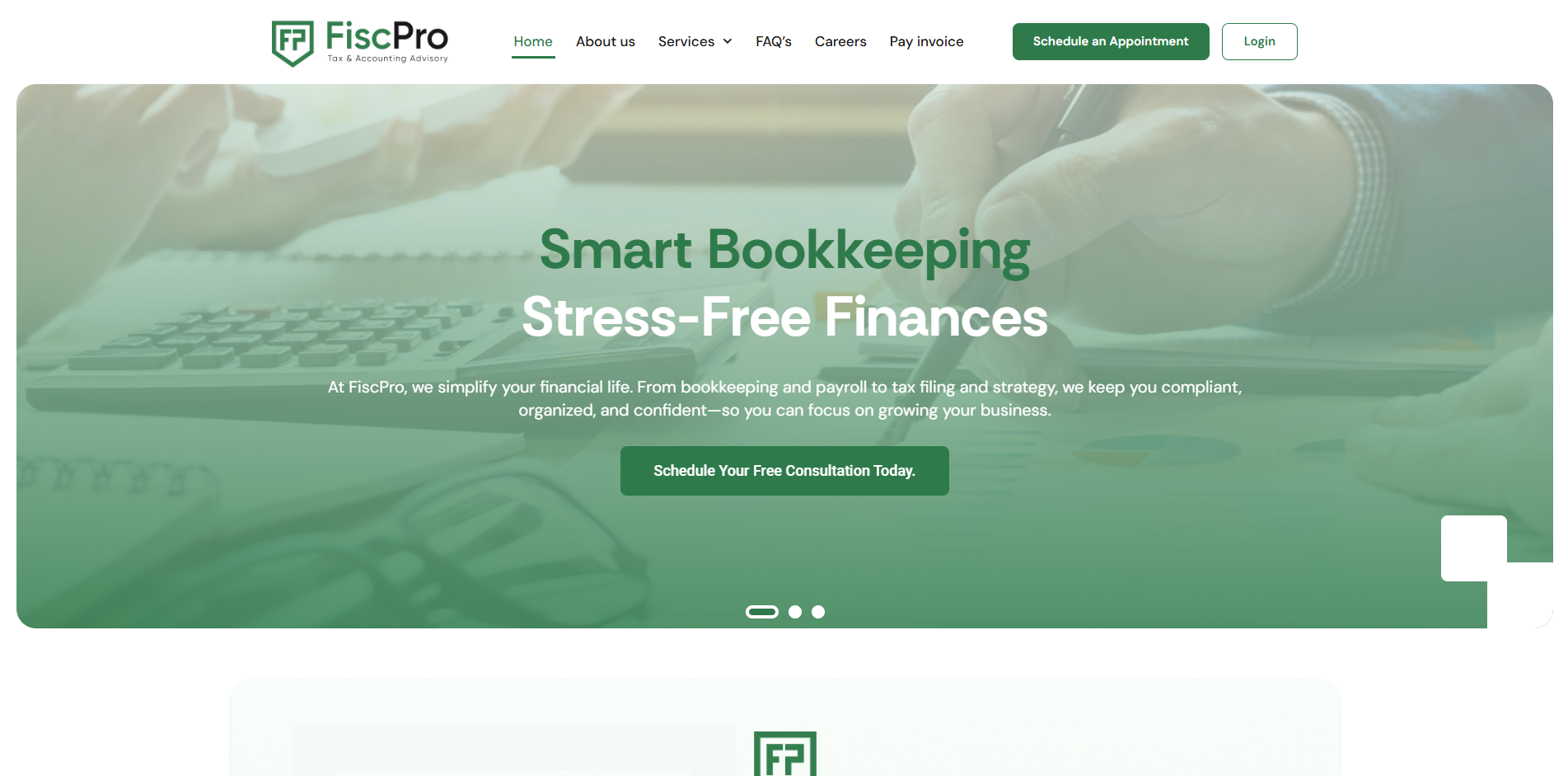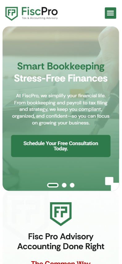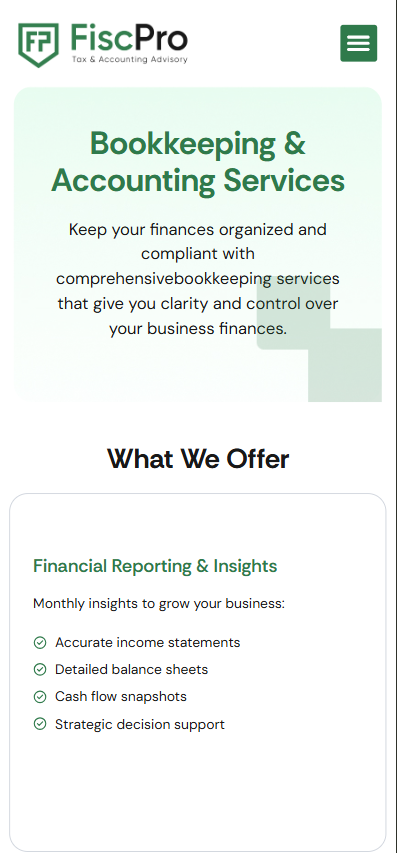 Building on the brand identity, we designed a clean, intuitive UI/UX that enhances usability and engagement across devices. Our focus was on creating an easy‑to‑navigate layout that clearly communicates FiscPro’s services—such as bookkeeping, tax consulting, compliance, and business advisory—while guiding users effectively through the site.