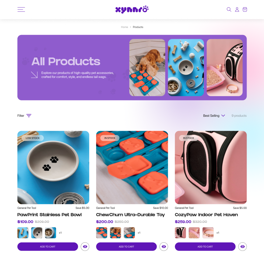 We began by creating a custom logo that reflects Xynnro’s playful, friendly, and pet-focused identity, establishing a strong visual foundation for the brand. Building on this, we designed a user-centric UI/UX to ensure smooth navigation, seamless browsing, and an engaging shopping experience across all devices.
