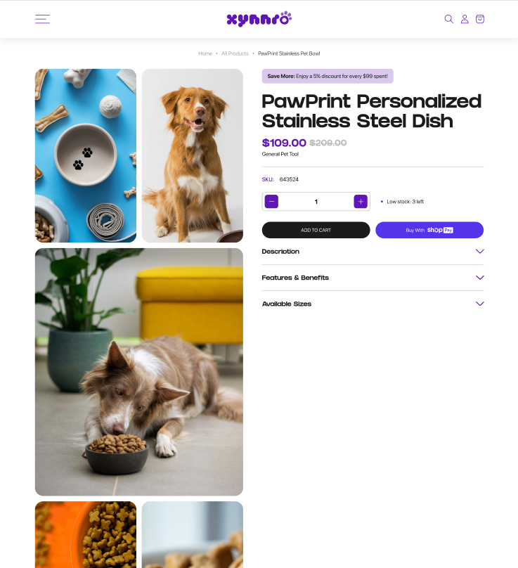 Xynnro is an e‑commerce brand specializing in pet products, including accessories, bowls, toys, and houses for cats and dogs. For this project, our agency delivered a complete branding and digital solution, including logo design, UI/UX design, and a fully custom Shopify website with a bespoke theme.